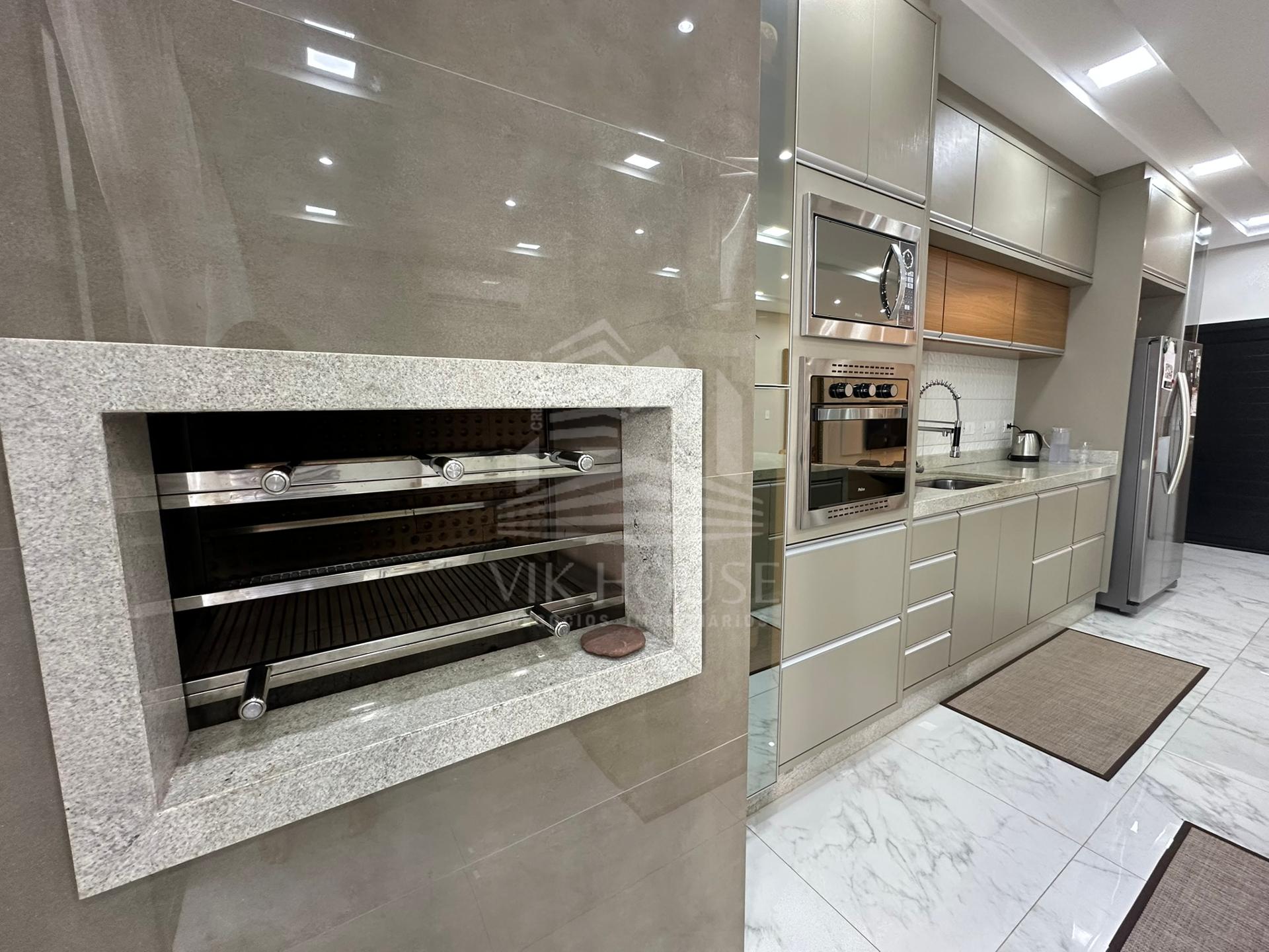 - 3 suítes sendo uma master com closet; - Sala de estar para dois ambientes com pé direito duplo; - Cozinha gourmet com churrasqueira; - Lavabo; - Ampla área externa; - Lavanderia; - Garagem coberta para dois carros; - Depósito; - Passagem lateral;